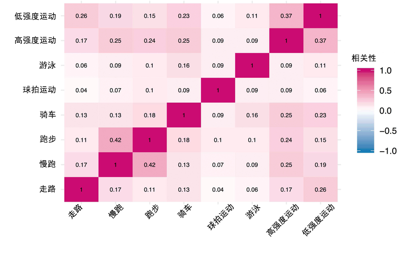 • 各类身体活动之间都有一定程度的正相关(r = 0.04 ~ 0.42)。